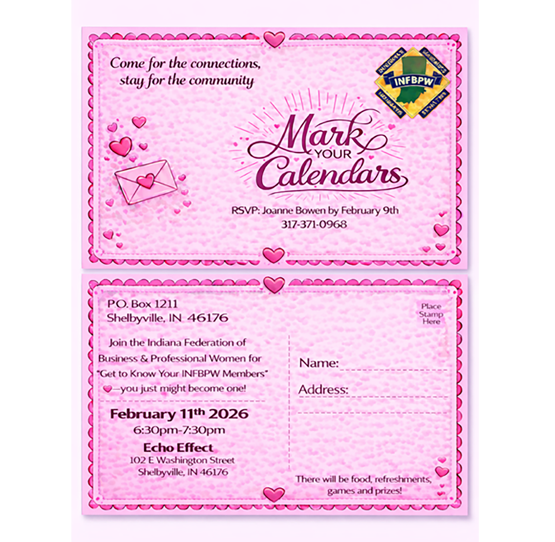 You are invited to an event to get to know your INFBPW Members (Indiana Federation of Business and Professional Women) on Feb. 11 at Echo Effect from 6:30-7:30pm. There will be food, refreshments, games and prizes! Please RSVP to Joanne Bowen by Feb. 9 at 317-371-0968 or jrtrophies@hotmail.com.