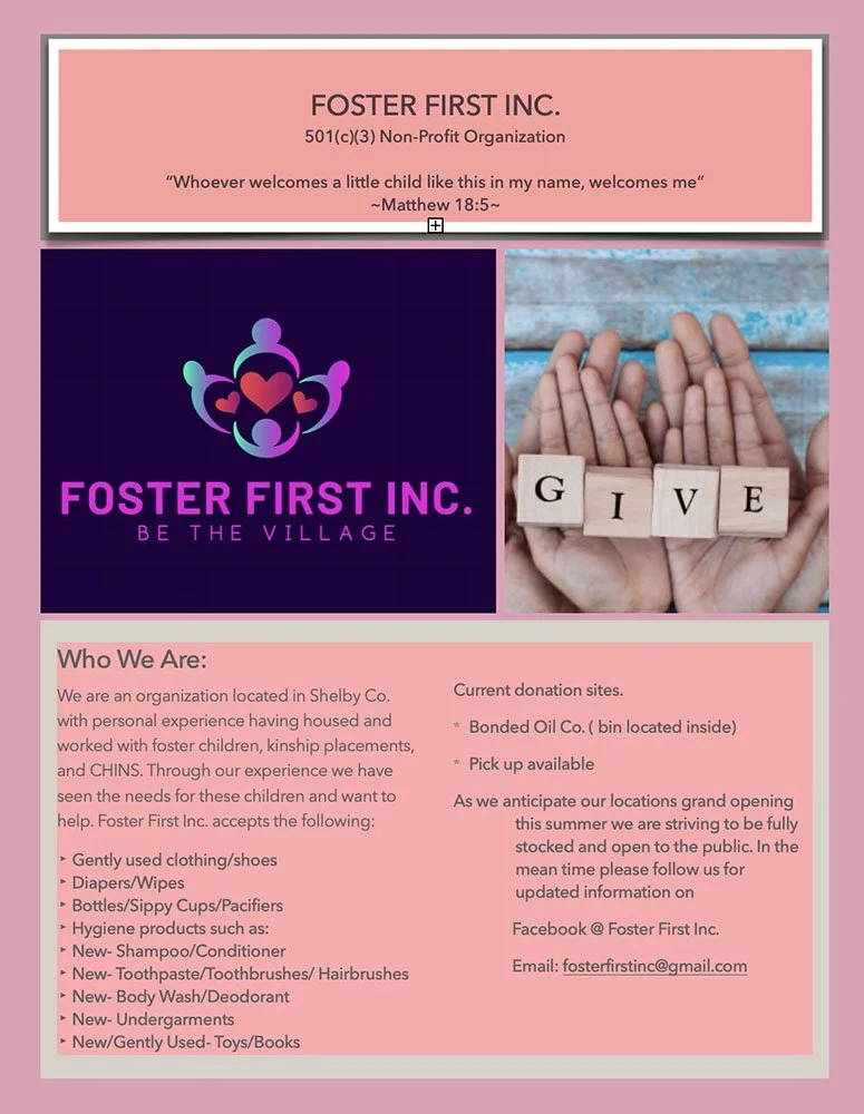 Welcome to the Shelby County Nonprofit family, Foster First Inc.! They are an organization located in Shelby Co. with personal experience working with foster children, kinship placements, and CHINS. Through their experience, they have seen the needs for the children and want to help.