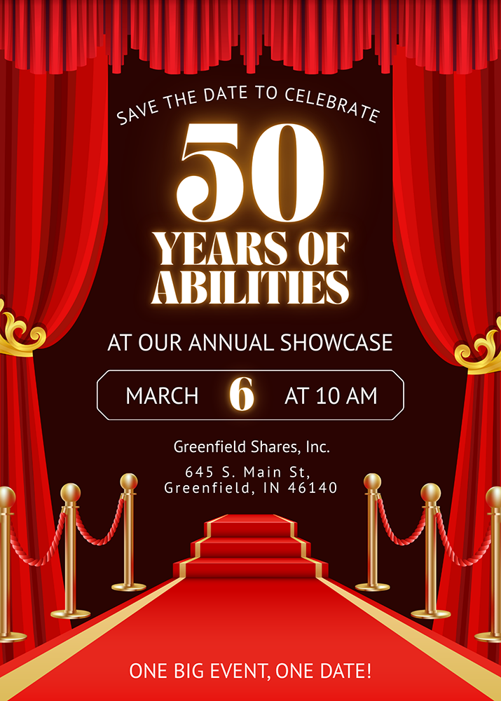 Shares Inc. is celebrating 50 years of service at their annual showcase on March 6 at 10am at their Greenfield location (645 S Main St. Greenfield, IN).