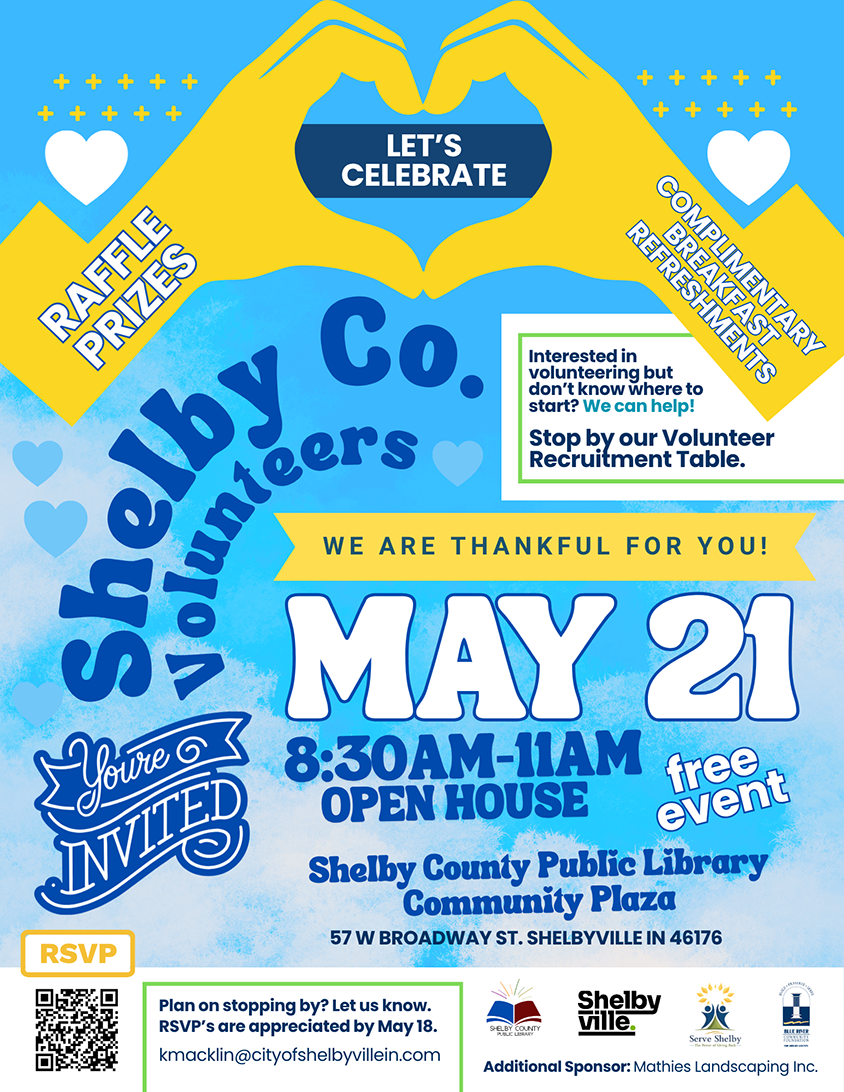 WHAT: Did you volunteer during the 2025-2026 year? Are you interested in learning more about how you can become a community volunteer? The City of Shelbyville BHE Department, Blue River Community Foundation, and Shelby County Public Library are partnering to host an open house style breakfast between 8:30am-11am. Come enjoy some good food and enter drawings for some prizes. Volunteers help reduce burnout and increase mental wellness within organizations and communities. We know our community is a better place with volunteers and we want to show our gratitude. If you plan on stopping by, please RSVP by Mon., May 18.